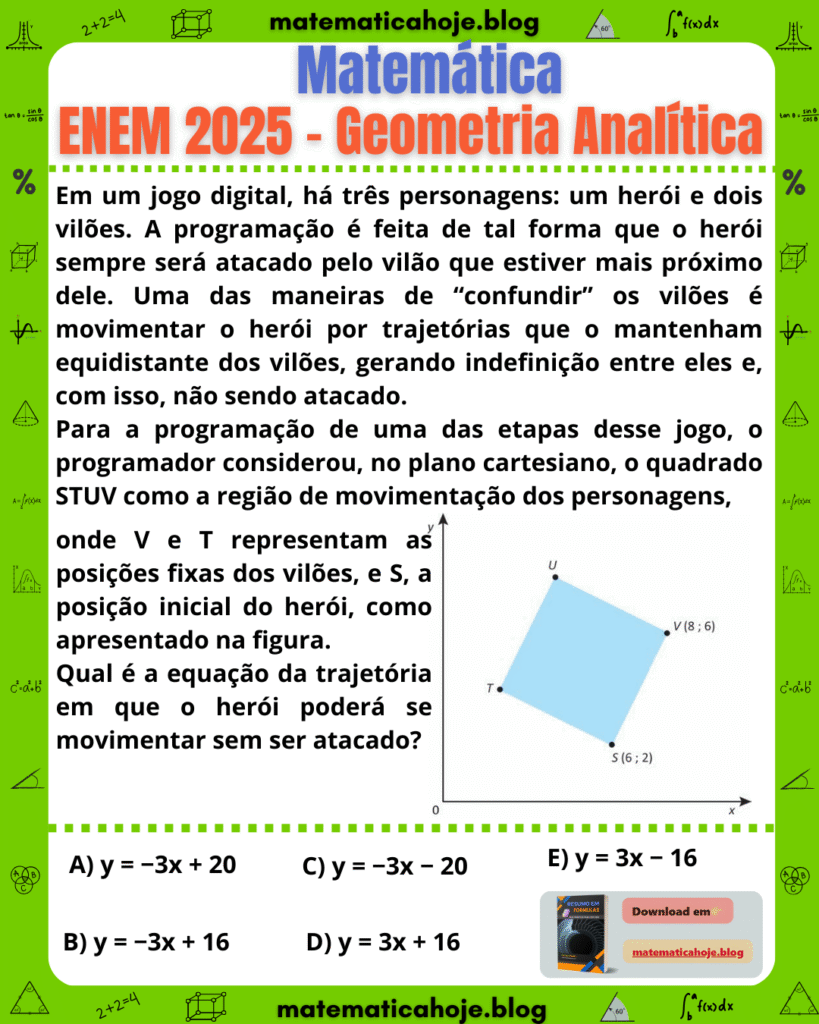 Nesta questão do ENEM 2025, o herói está em um plano cartesiano junto a dois vilões. Ele só estará seguro se