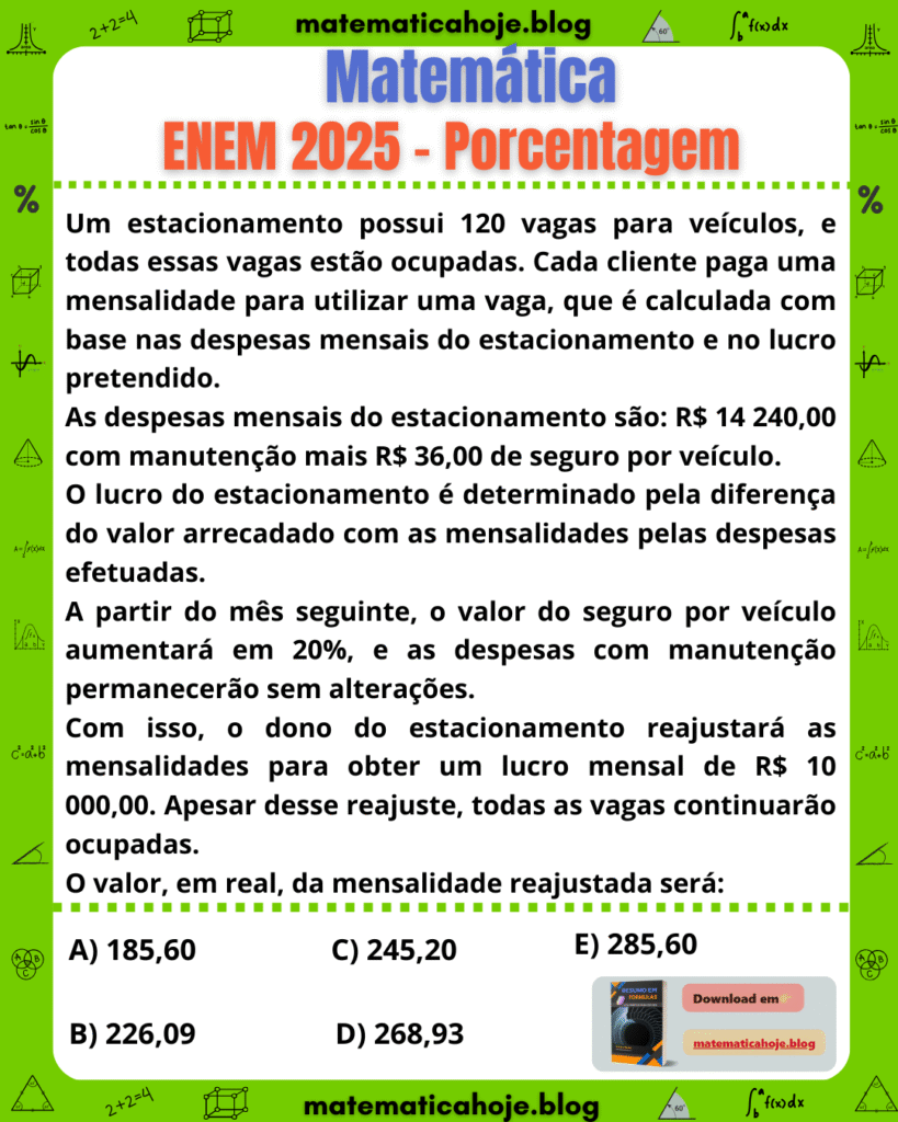 Nesta questão do ENEM 2025, um estacionamento possui 120 vagas, todas ocupadas, e o dono precisa reajustar a mensalidade após um