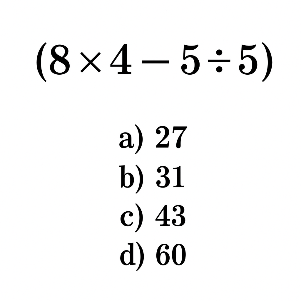 Expressão Numérica — Passo a Passo Resolva a expressão: \((8 \times 4 – 5 \div 5)\) A) 27 B) 31 C)