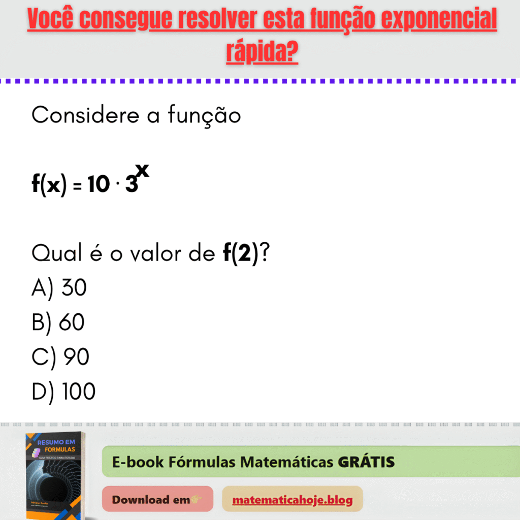 ⚡ DESAFIO RÁPIDO Função exponencial — calcule f(2) Considere a função \(f(x)=10\cdot 3^x\). Qual é o valor de f(2)? A) 30