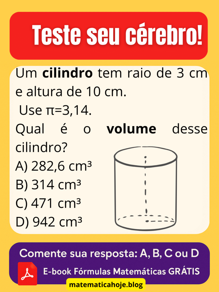 🧮 Volume do Cilindro — Exercício Resolvido Passo a Passo Um cilindro tem raio de 3 cm e altura de 10