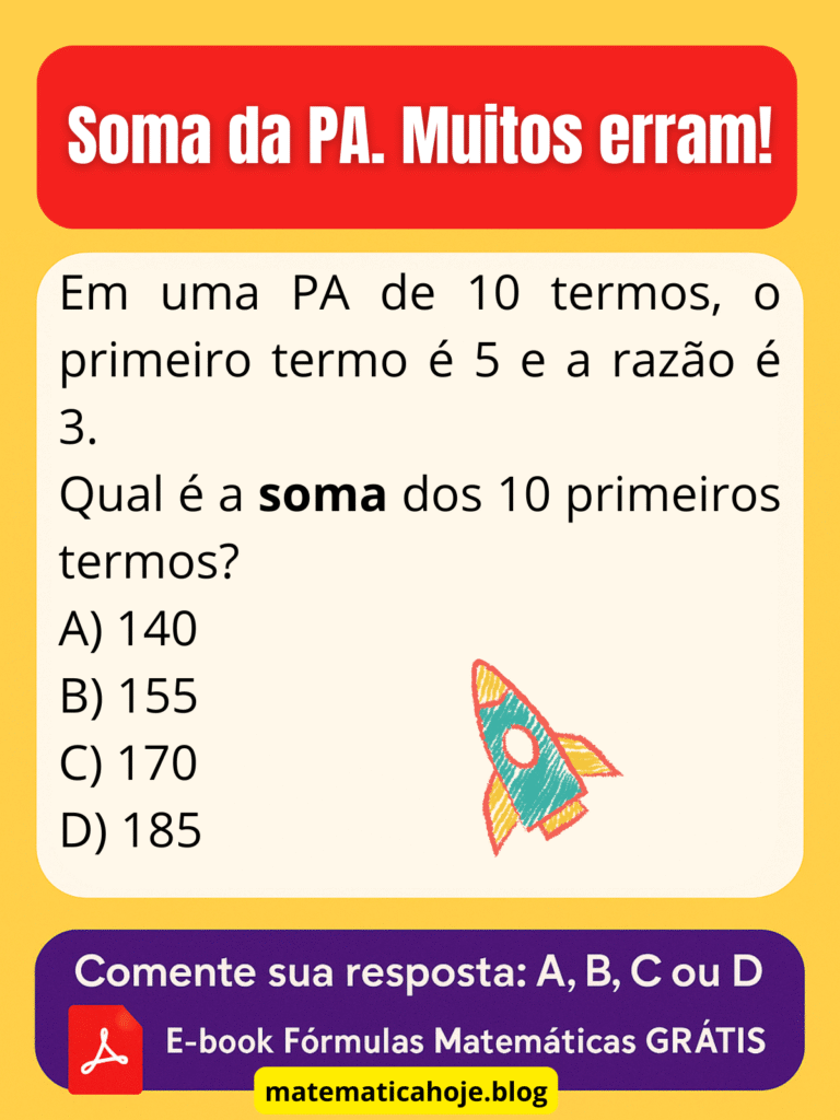 ⚡ DESAFIO RÁPIDO PA — Soma dos n primeiros termos Em uma PA de 10 termos, com primeiro termo 5 e