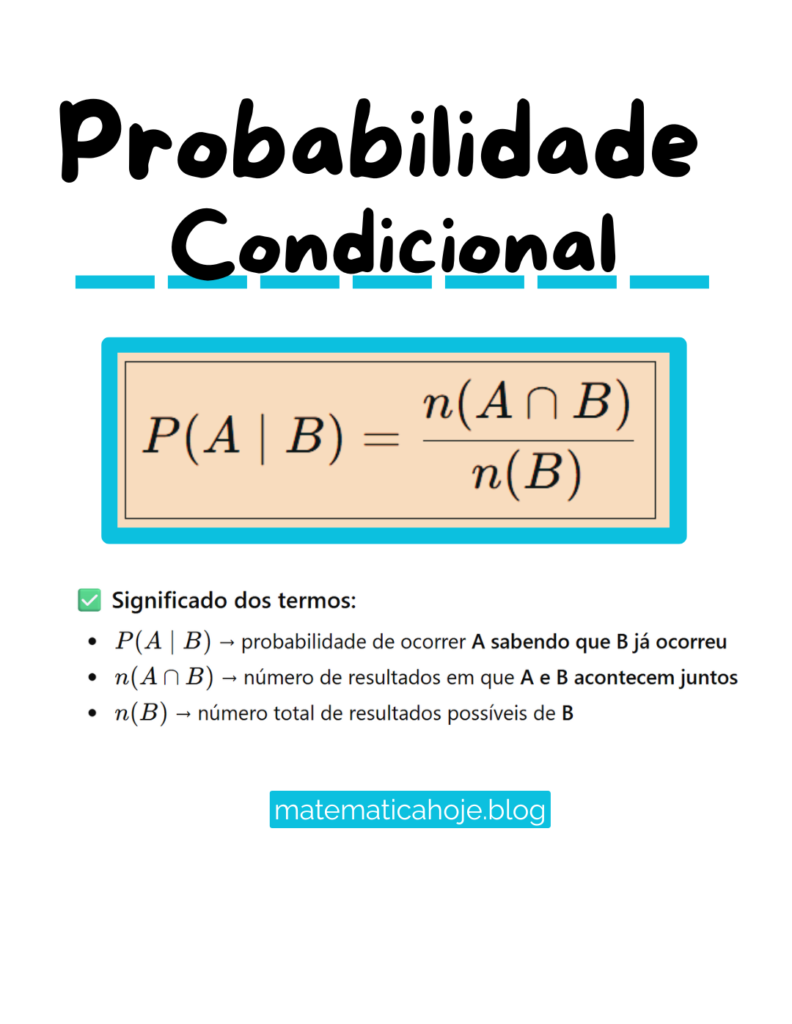 Probabilidade Condicional — Fórmula, Interpretação e Exercícios A Probabilidade Condicional aparece quando queremos calcular a chance de um evento acontecer sabendo