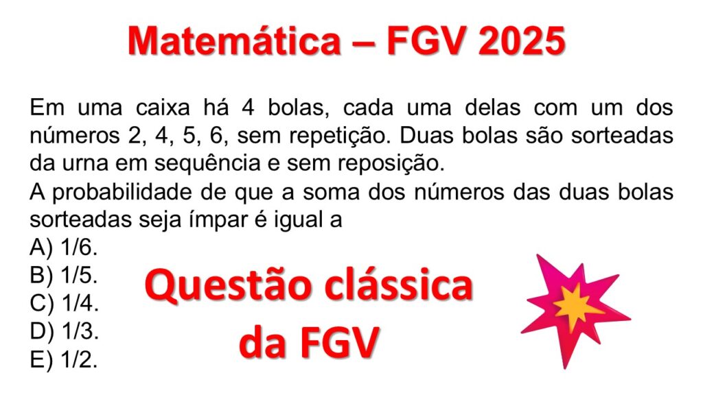 FGV 2025 Matemática: Probabilidade de Soma Ímpar (Sorteio sem Reposição)