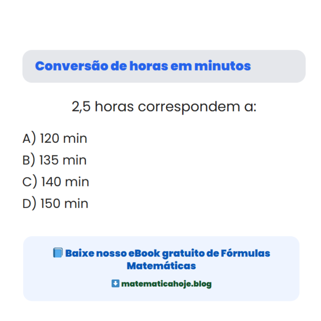 Conversão de tempo: 2,5 horas em minutos Questões de conversão de unidades de tempo são comuns em provas e avaliações. Conversão