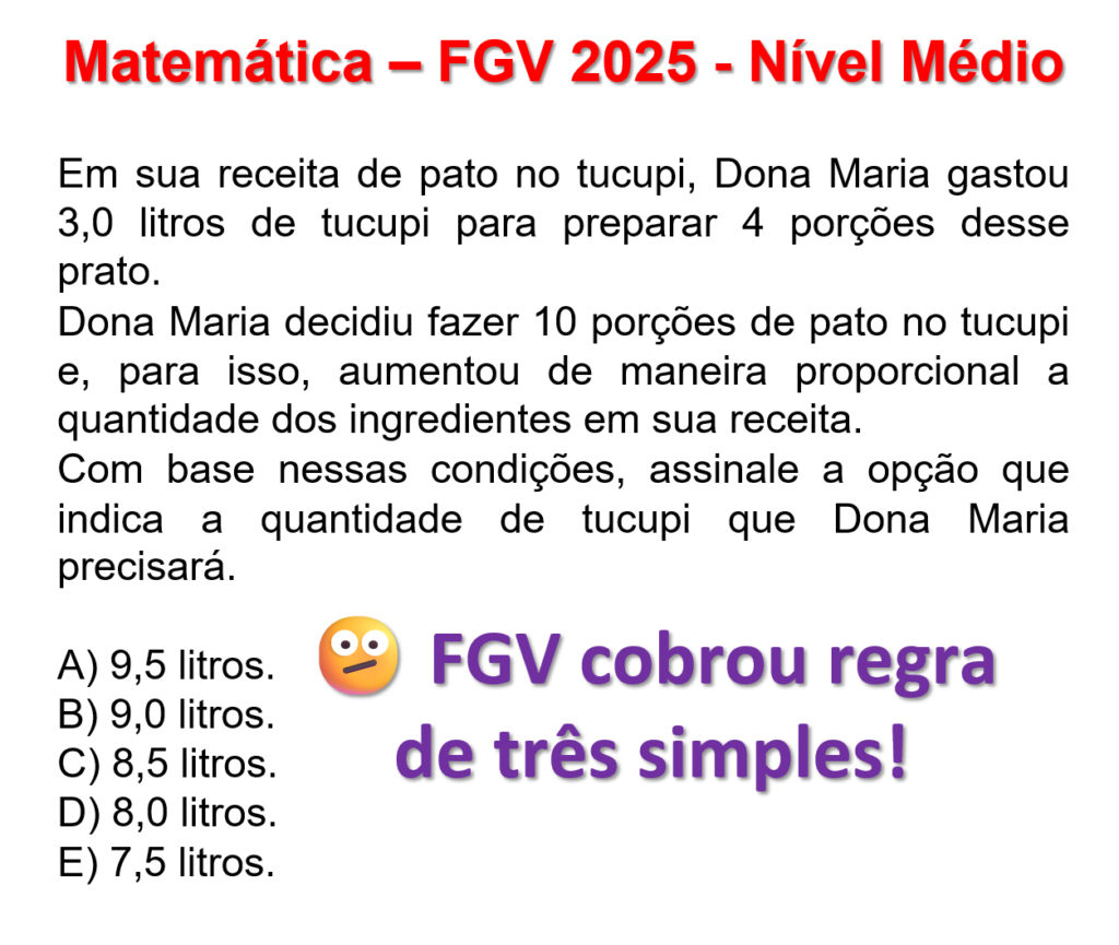 Proporção em receita – FGV 2025 Matemática – FGV 2025 – Nível Médio Conteúdo: Proporcionalidade