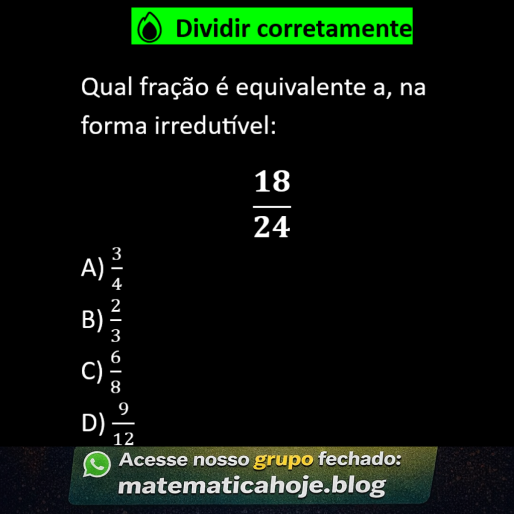 Ver solução completa 1 – Entendendo o enunciado Precisamos simplificar a fração 18/24 até sua