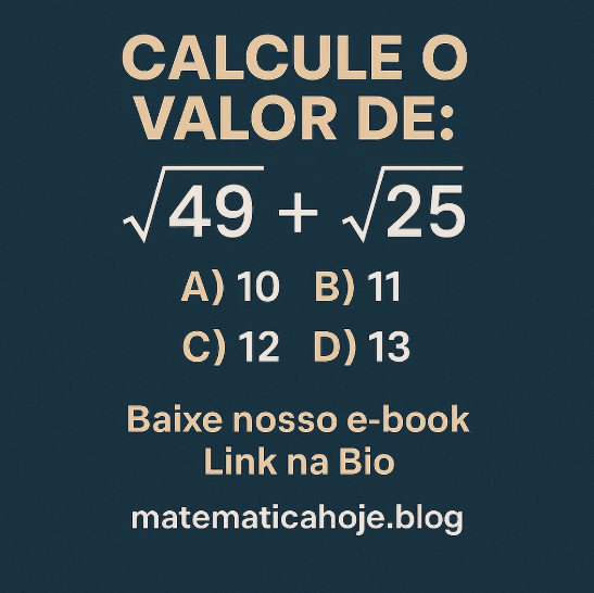 Continue lendoQuestão Cálculo com Raízes Quadradas Calcule o valor da expressão: \(\sqrt{49} + \sqrt{25}\) A) 10 B) 11 C) 12 D)