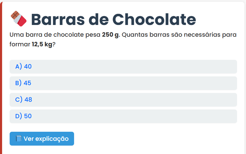 Continue lendoQuantidade de Barras de Chocolate 🍫 Barras de Chocolate Uma barra de chocolate pesa 250 g. Quantas barras são necessárias