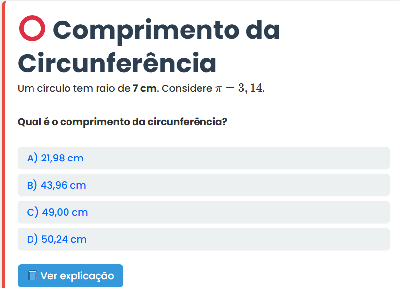 Continue lendoComprimento da Circunferência ⭕ Comprimento da Circunferência Um círculo tem raio de 7 cm. Considere \(\pi = 3,14\). Qual é