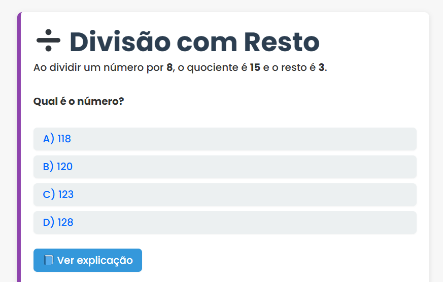 Continue lendoDivisão com Resto – Número Procurado ➗ Divisão com Resto Ao dividir um número por 8, o quociente é 15