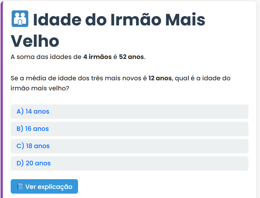 Continue lendoIdade do Irmão Mais Velho 👨👩👦 Idade do Irmão Mais Velho A soma das idades de 4 irmãos é 52