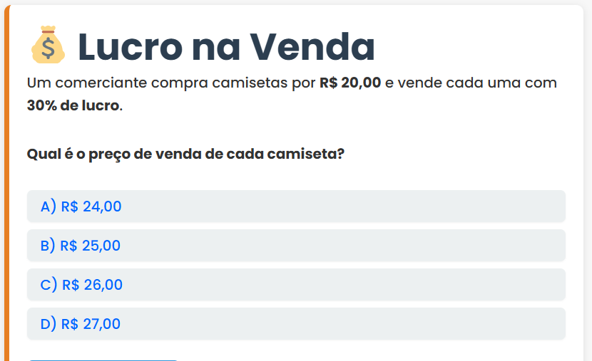 Continue lendoLucro na Venda de Camisetas 💰 Lucro na Venda Um comerciante compra camisetas por R$ 20,00 e vende cada uma