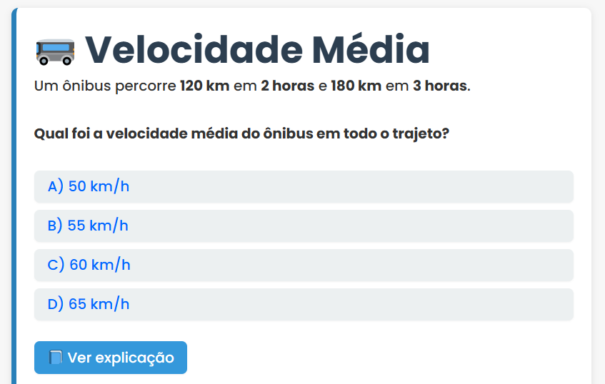 Continue lendoVelocidade Média do Ônibus 🚌 Velocidade Média Um ônibus percorre 120 km em 2 horas e 180 km em 3