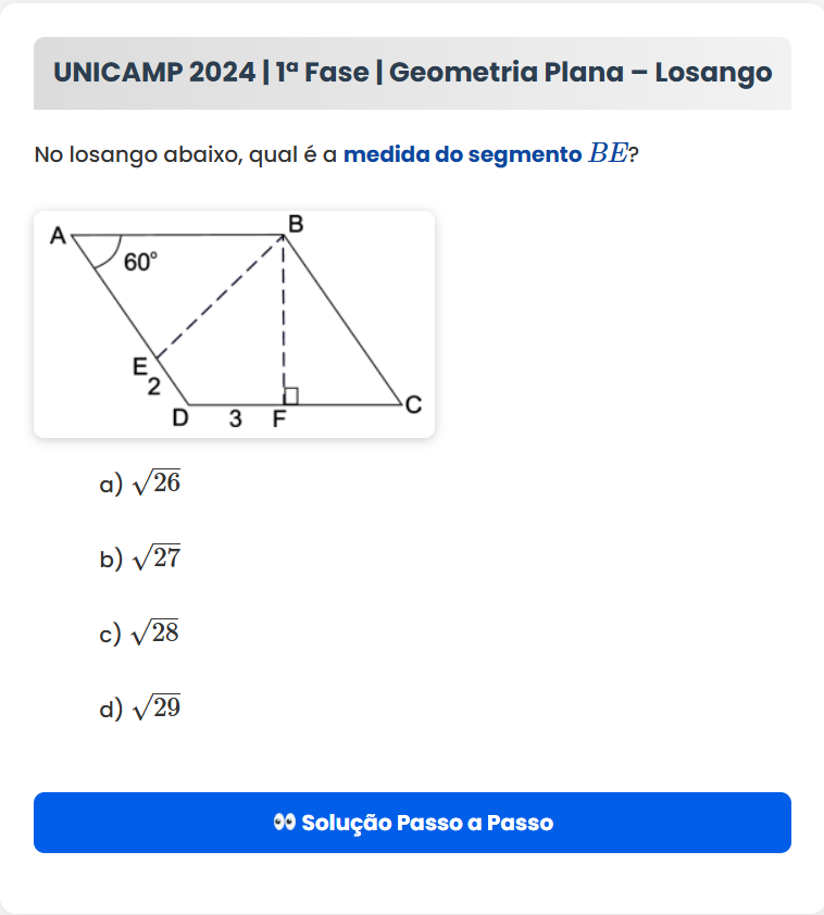 Continue lendoUNICAMP 2024 | Matemática | 2ª Fase | Geometria Plana – Losango UNICAMP 2024 | Matemática | 2ª Fase |