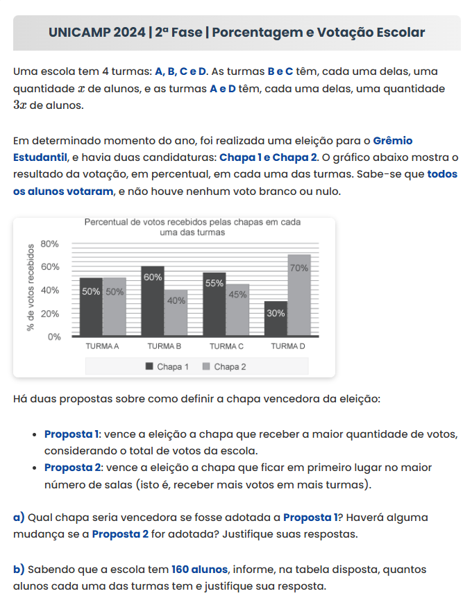 Continue lendoUNICAMP 2024 | Matemática | 2ª Fase | Porcentagem e Votação Escolar UNICAMP 2024 | Matemática | 2ª Fase |