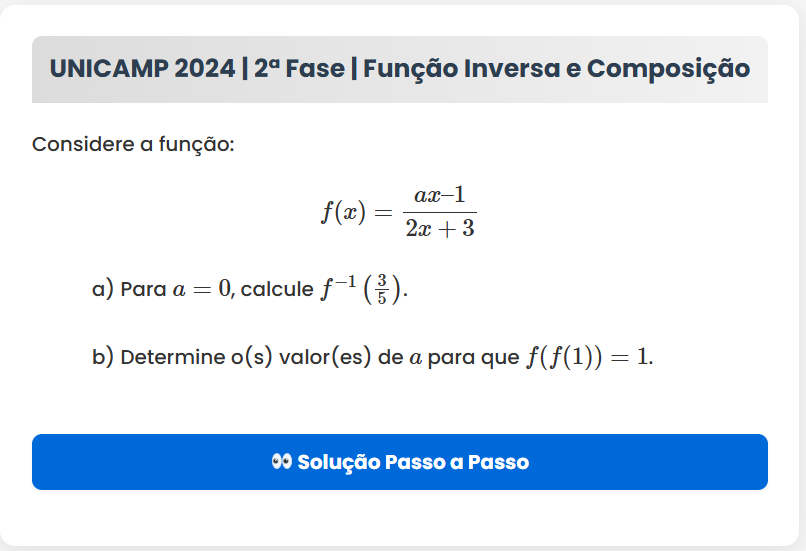 Continue lendoUNICAMP 2024 | Matemática | 2ª Fase | Função Inversa e Composição UNICAMP 2024 | Matemática | 2ª Fase |