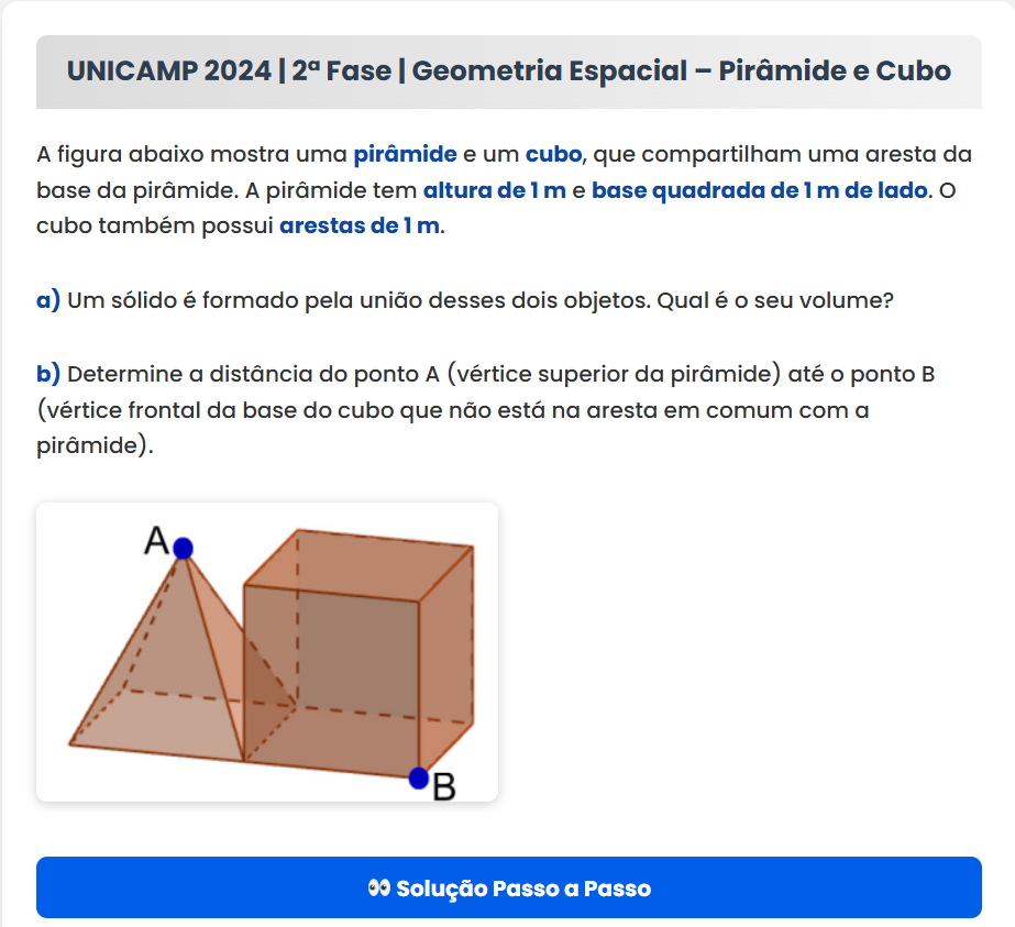 Continue lendoUNICAMP 2024 | Matemática | 2ª Fase | Geometria Espacial – Pirâmide e Cubo UNICAMP 2024 | Matemática | 2ª