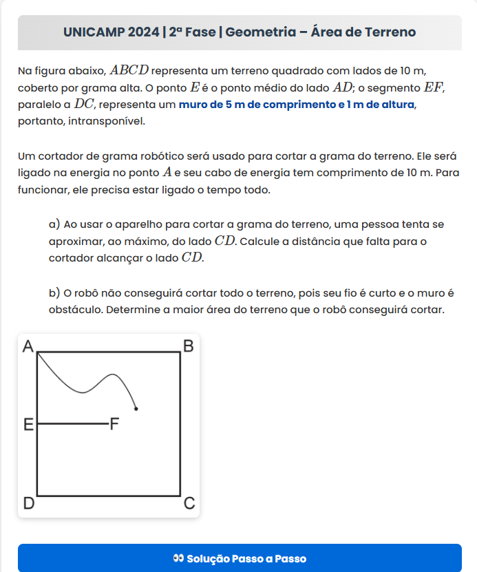 Continue lendoUNICAMP 2024 | Matemática | 2ª Fase | Geometria – Área de Terreno UNICAMP 2024 | Matemática | 2ª Fase