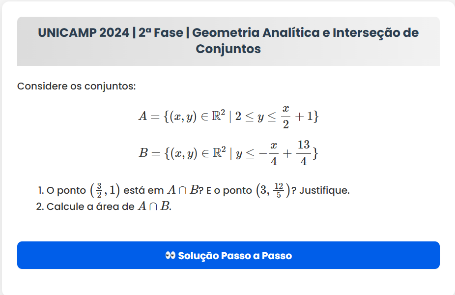 Continue lendoUNICAMP 2024 | Matemática | 2ª Fase | Geometria Analítica e Interseção de Conjuntos UNICAMP 2024 | Matemática | 2ª