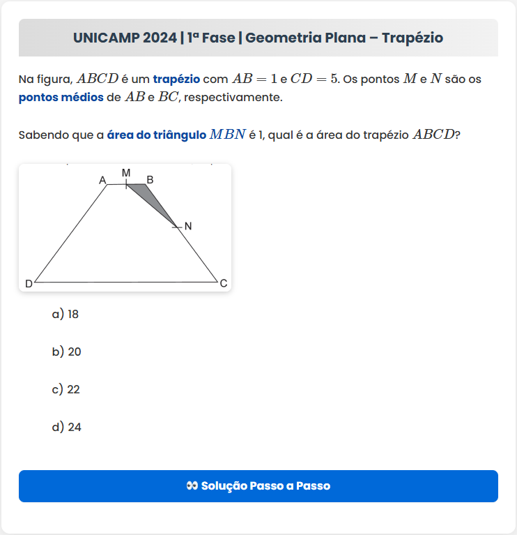 Continue lendoUNICAMP 2024 | Matemática | 1ª Fase | Geometria Plana – Trapézio UNICAMP 2024 | Matemática | 1ª Fase |