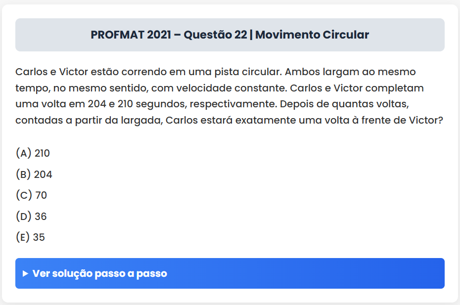 Continue lendoPROFMAT 2021 – Questão 22 | Movimento Circular PROFMAT 2021 – Questão 22 | Movimento Circular Carlos e Victor estão