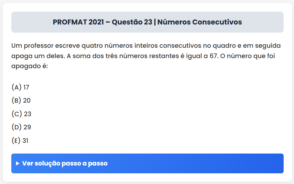Continue lendoPROFMAT 2021 – Questão 23 | Números Consecutivos PROFMAT 2021 – Questão 23 | Números Consecutivos Um professor escreve quatro