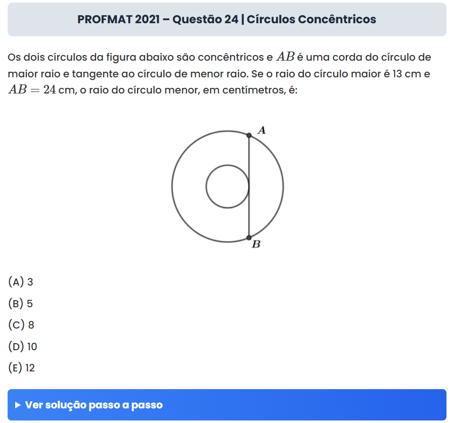 Continue lendoPROFMAT 2021 – Questão 24 | Círculos Concêntricos PROFMAT 2021 – Questão 24 | Círculos Concêntricos Os dois círculos da