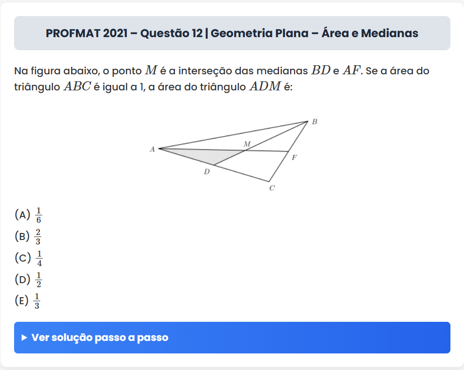 Continue lendoPROFMAT 2021 – Questão 12 | Geometria Plana – Área e Medianas PROFMAT 2021 – Questão 12 | Geometria Plana