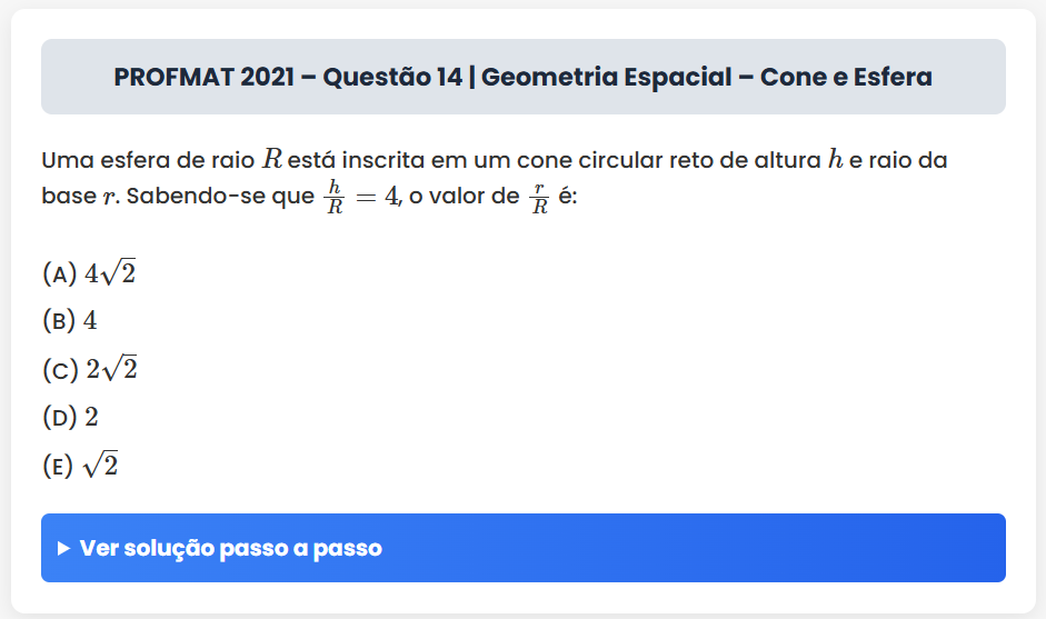 Continue lendoPROFMAT 2021 – Questão 14 | Geometria Espacial – Cone e Esfera PROFMAT 2021 – Questão 14 | Geometria Espacial