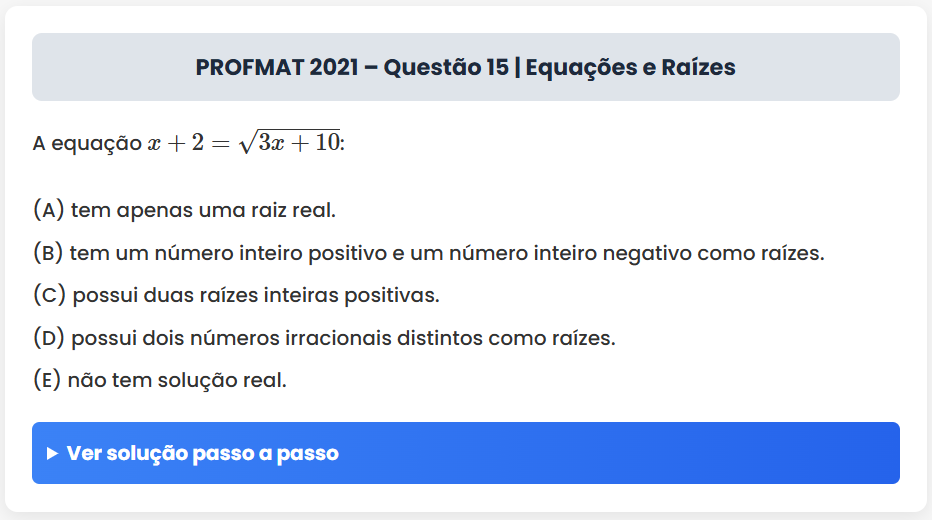 Continue lendoPROFMAT 2021 – Questão 15 | Equações e Raízes PROFMAT 2021 – Questão 15 | Equações e Raízes A equação