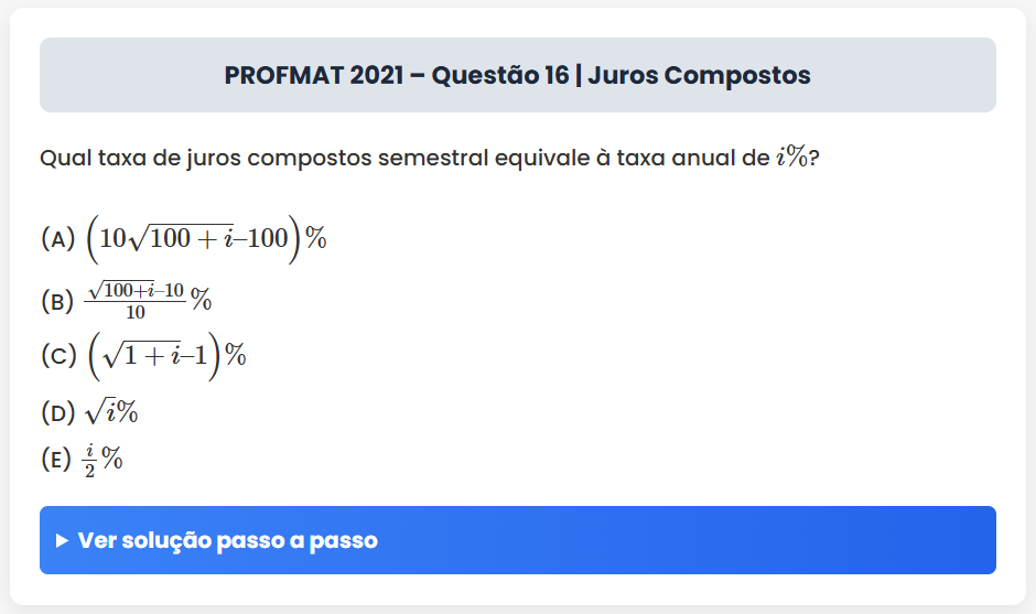 Continue lendoPROFMAT 2021 – Questão 16 | Juros Compostos PROFMAT 2021 – Questão 16 | Juros Compostos Qual taxa de juros