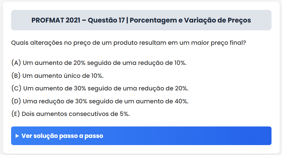 Continue lendoPROFMAT 2021 – Questão 17 | Porcentagem e Variação de Preços PROFMAT 2021 – Questão 17 | Porcentagem e Variação