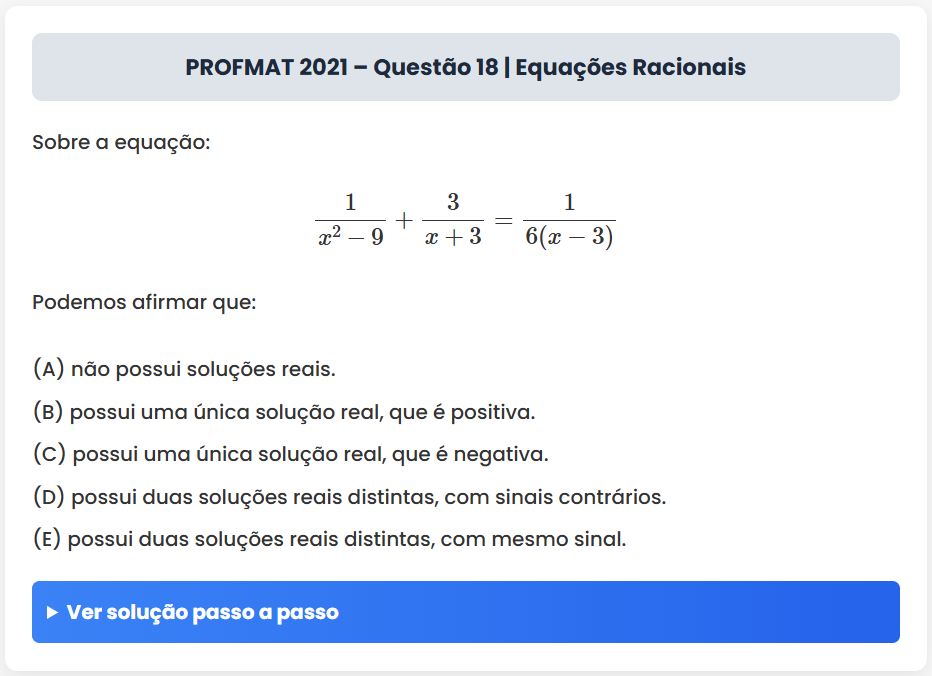 Continue lendoPROFMAT 2021 – Questão 18 | Equações Racionais PROFMAT 2021 – Questão 18 | Equações Racionais Sobre a equação: \[