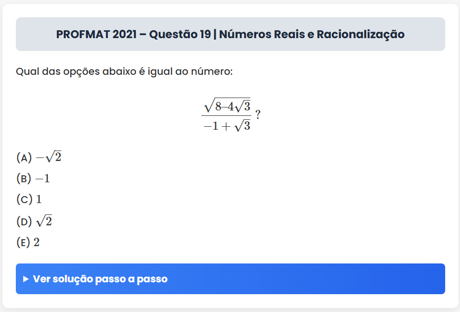 Continue lendoPROFMAT 2021 – Questão 19 | Números Reais e Racionalização PROFMAT 2021 – Questão 19 | Números Reais e Racionalização