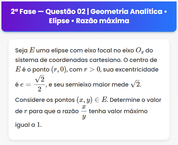 Continue lendo2ª Fase — Questão 02 | ITA 2025 2ª Fase — Questão 02 | Geometria Analítica • Elipse • Razão