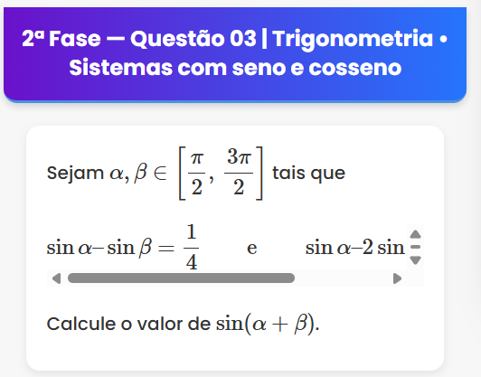 Continue lendo2ª Fase — Questão 03 | ITA 2025 2ª Fase — Questão 03 | Trigonometria • Sistemas com seno e