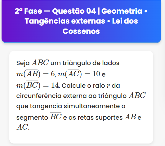 Continue lendo2ª Fase — Questão 04 | ITA 2025 2ª Fase — Questão 04 | Geometria • Tangências externas • Lei