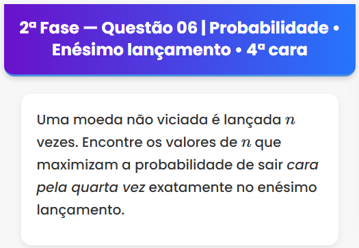 Continue lendo2ª Fase — Questão 06 | ITA 2025 2ª Fase — Questão 06 | Probabilidade • Enésimo lançamento • 4ª
