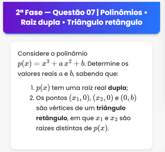 Continue lendo2ª Fase — Questão 07 | ITA 2025 2ª Fase — Questão 07 | Polinômios • Raiz dupla • Triângulo