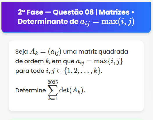 Continue lendo2ª Fase — Questão 08 | ITA 2025 2ª Fase — Questão 08 | Matrizes • Determinante de \(a_{ij}=\max(i,j)\) Seja