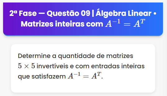 Continue lendo2ª Fase — Questão 09 | ITA 2025 2ª Fase — Questão 09 | Álgebra Linear • Matrizes inteiras com
