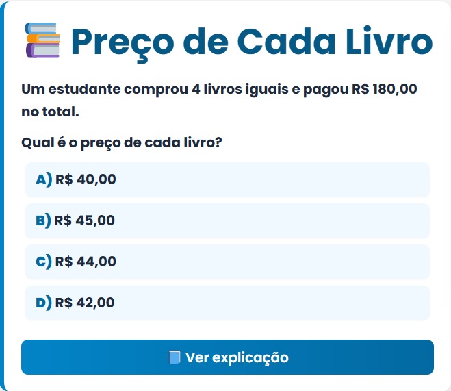 Continue lendoPreço de Cada Livro 📚 Preço de Cada Livro Um estudante comprou 4 livros iguais e pagou R$ 180,00 no