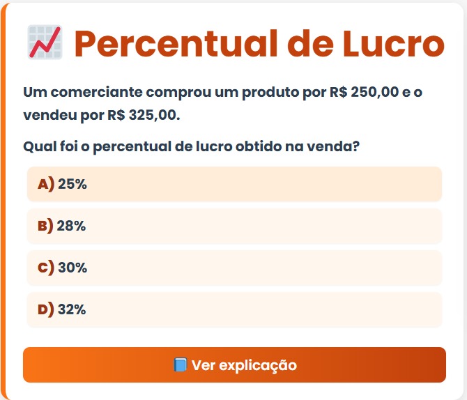 Continue lendoPercentual de Lucro 📈 Percentual de Lucro Um comerciante comprou um produto por R$ 250,00 e o vendeu por R$