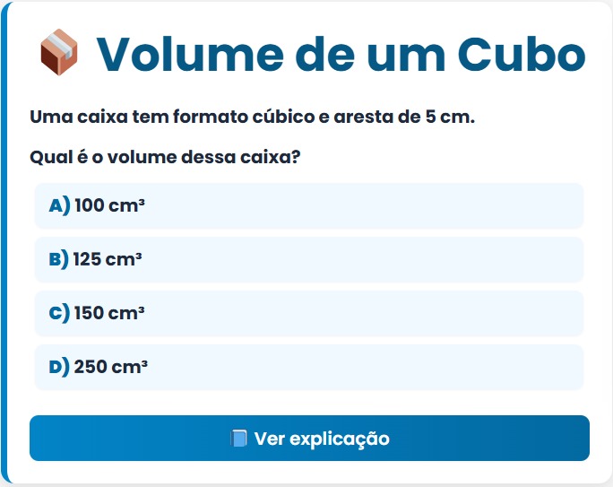 Continue lendoVolume de um Cubo 📦 Volume de um Cubo Uma caixa tem formato cúbico e aresta de 5 cm. Qual