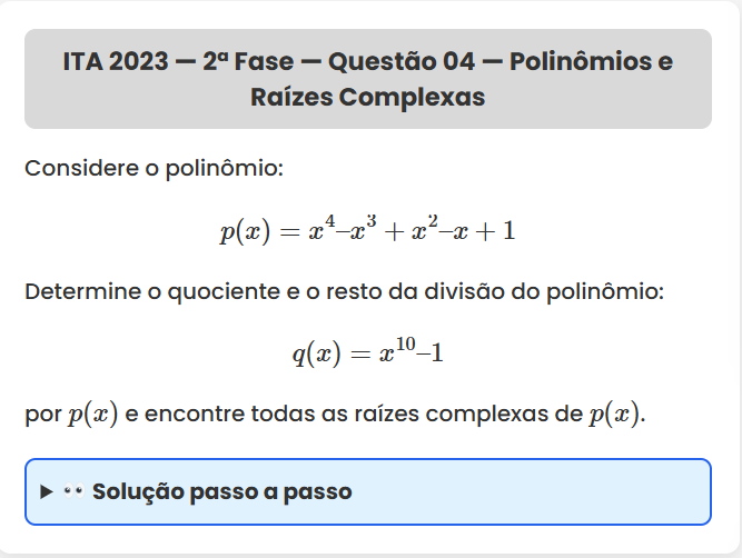 Continue lendoITA 2023 — 2ª Fase — Questão 04 ITA 2023 — 2ª Fase — Questão 04 — Polinômios e Raízes