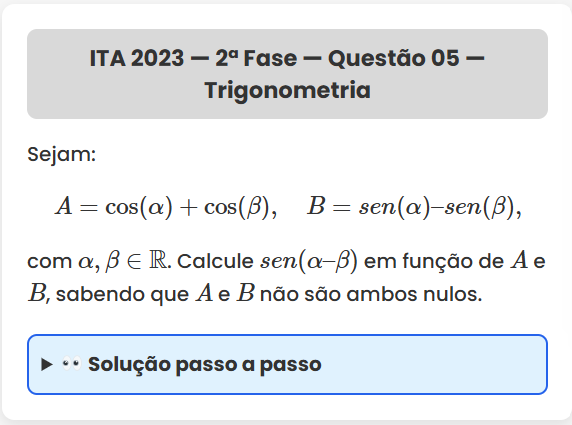 Continue lendoITA 2023 — 2ª Fase — Questão 05 ITA 2023 — 2ª Fase — Questão 05 — Trigonometria Sejam: \[