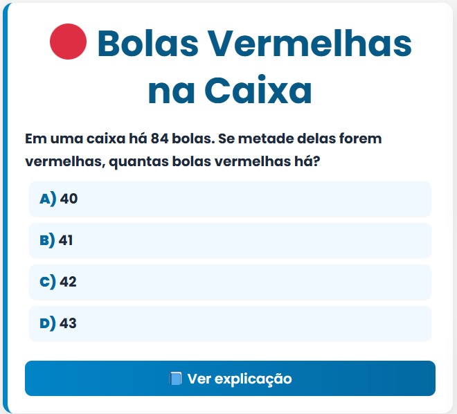 Continue lendoBolas Vermelhas na Caixa 🔴 Bolas Vermelhas na Caixa Em uma caixa há 84 bolas. Se metade delas forem vermelhas,