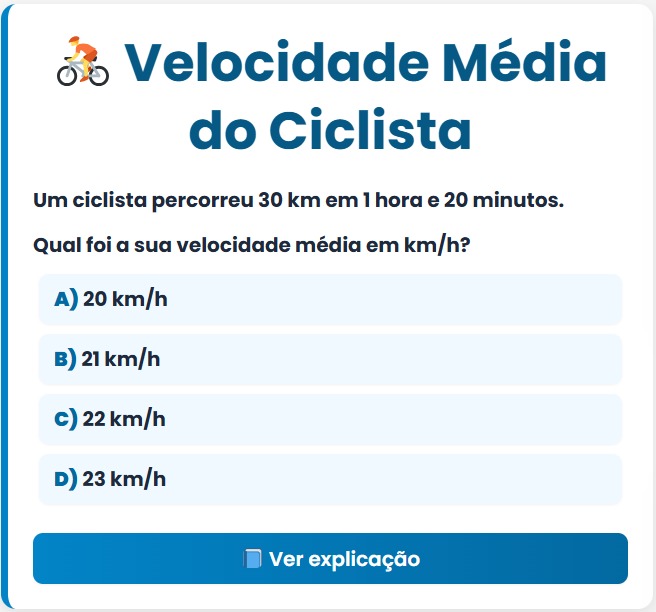 Continue lendoVelocidade Média do Ciclista 🚴 Velocidade Média do Ciclista Um ciclista percorreu 30 km em 1 hora e 20 minutos.
