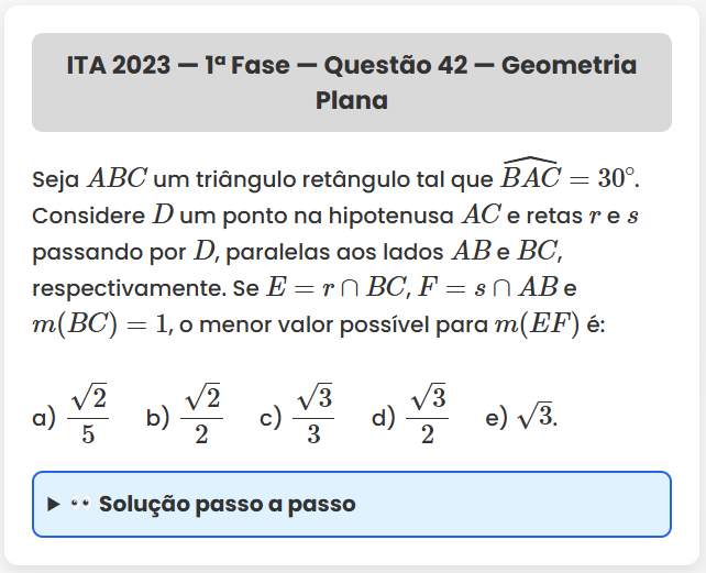 Continue lendoITA 2023 — 1ª Fase — Questão 42 ITA 2023 — 1ª Fase — Questão 42 — Geometria Plana Seja